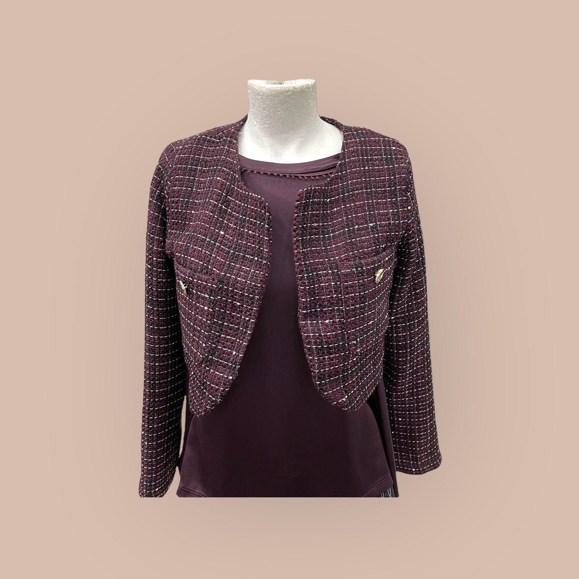 Il giacchino destrutturato Audrey è realizzato in un morbido tessuto tipo chanel, con tasche laterali e un bottone applicato. Aggiungi un tocco di eleganza e praticità al tuo look grazie a questo capo corto e versatile. Perfetto per ogni occasione, in qualsiasi stagione.