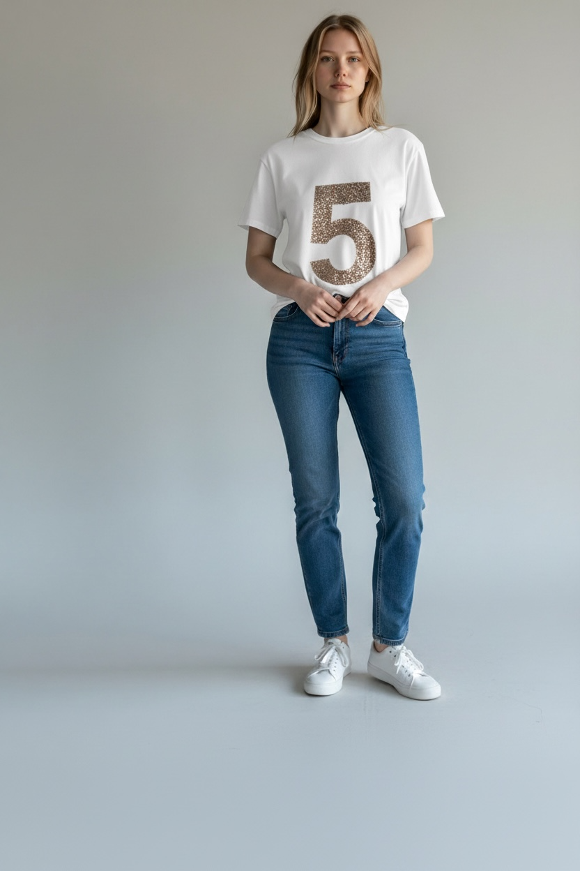 La T-shirt Five è realizzata in cotone elasticizzato di alta qualità, garantendo comfort e libertà di movimento. Il design presenta un numero 5 impresso in paillettes, che conferisce un tocco distintivo. Questa maglietta è ideale per un look casual e alla moda, perfetta per diverse occasioni.